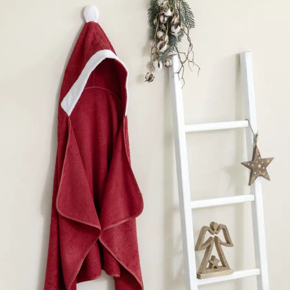 Η παιδική κάπα με κουκούλα Santa Claus από 100% βαμβάκι, σε πλούσιο κόκκινο χρώμα, θυμίζει τη στολή του Άγιου Βασίλη. Διακοσμείται με λευκή φάσα στην κουκούλα και μια χαριτωμένη λευκή φουντίτσα στην κορυφή, προσθέτοντας μια παιχνιδιάρικη πινελιά. Είναι το απόλυτο αξεσουάρ για να προσφέρετε άνεση και χαρά στις πιο κρύες και γιορτινές μέρες του χειμώνα. Το μαλακό υλικό της πετσέτας αγκαλιάζει το σώμα απαλά, κρατώντας το ζεστό και στεγνό μετά το μπάνιο, ενώ η κουκούλα προσφέρει έξτρα προστασία στο κεφάλι. Ιδανική για το σπίτι ή τις γιορτινές διακοπές, αυτή η πετσέτα δεν είναι απλά λειτουργική αλλά και διακοσμητική, φέρνοντας τη μαγεία των Χριστουγέννων στον καθημερινό σας χώρο. Εξαιρετική επιλογή για εορταστικό δωράκι σε μικρούς αγαπημένους φίλους.
