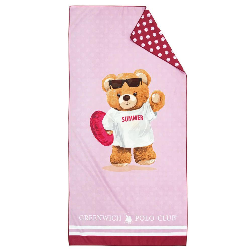 Παιδική πετσέτα μικροϊνών σε ροζ χρώμα, με φούξια λεπτομέρειες και σχέδιο αρκουδάκι από τον οίκο Greenwich Polo Club . Η πίσω όψη είναι σε φούξια χρώμα, με ροζ λεπτομέρειες και ριγέ σχέδιο. Είναι κατασκευασμένη από 100% microfiber βάρους 200gsm που την καθιστά ελαφριά και υπέρ-απορροφητική και στεγνώνει γρήγορα. Ιδανική καλοκαιρινή επιλογή για να χαρίσει χαρά και όρεξη για περισσότερο παιχνίδι στους μικρούς μας φίλους.