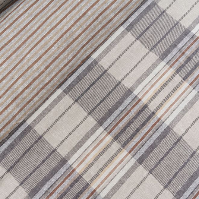 Σεντόνια μονά σετ σε μπεζ φόντο, με γκρι λεπτομέρειες και καρό σχέδιο από την εταιρεία Vesta Home. Είναι κατασκευασμένα από 100% βαμβάκι 144 κλωστών, που τα καθιστά ανθεκτικά και απαλά. Το κατωσέντονο έχει ριγέ σχέδιο σε γκρι-μπεζ χρώμα και διατίθεται με λάστιχο ή χωρίς λάστιχο. Στο σετ περιλαμβάνεται η μαξιλαροθήκη φάκελος με το σχέδιο του πανωσέντονου. Συνδυάστε τα με τα υπόλοιπα προϊόντα του ίδιου σχεδίου για ένα ολοκληρωμένο αποτέλεσμα.