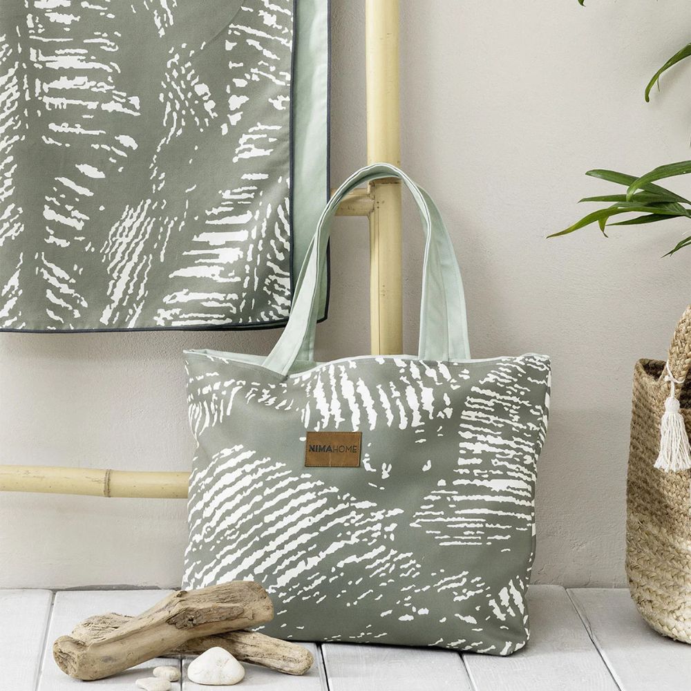 Τσάντα παραλίας σε χακί χρώμα, με εκρού λεπτομέρειες και μοντέρνο σχέδιο από την εταιρεία Nima. Το εξωτερικό ύφασμα είναι από 100% microfiber. Διαθέτει κλείσιμο κουμπί, ενώ στο εσωτερικό της έχει τσεπάκι. Συνδυάστε την με τα υπόλοιπα είδη θαλάσσης της ίδιας συλλογής.